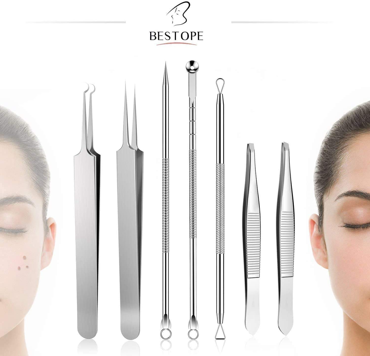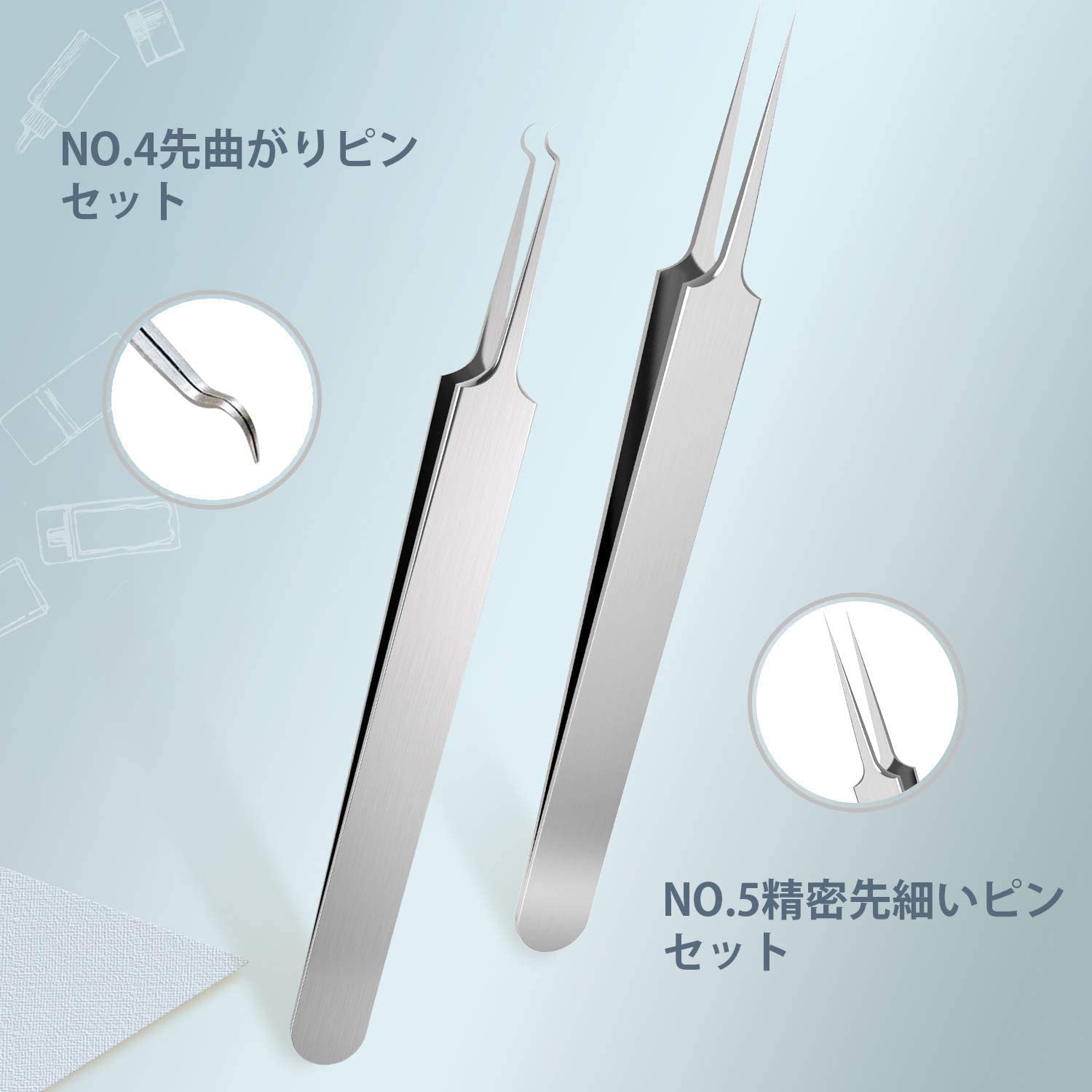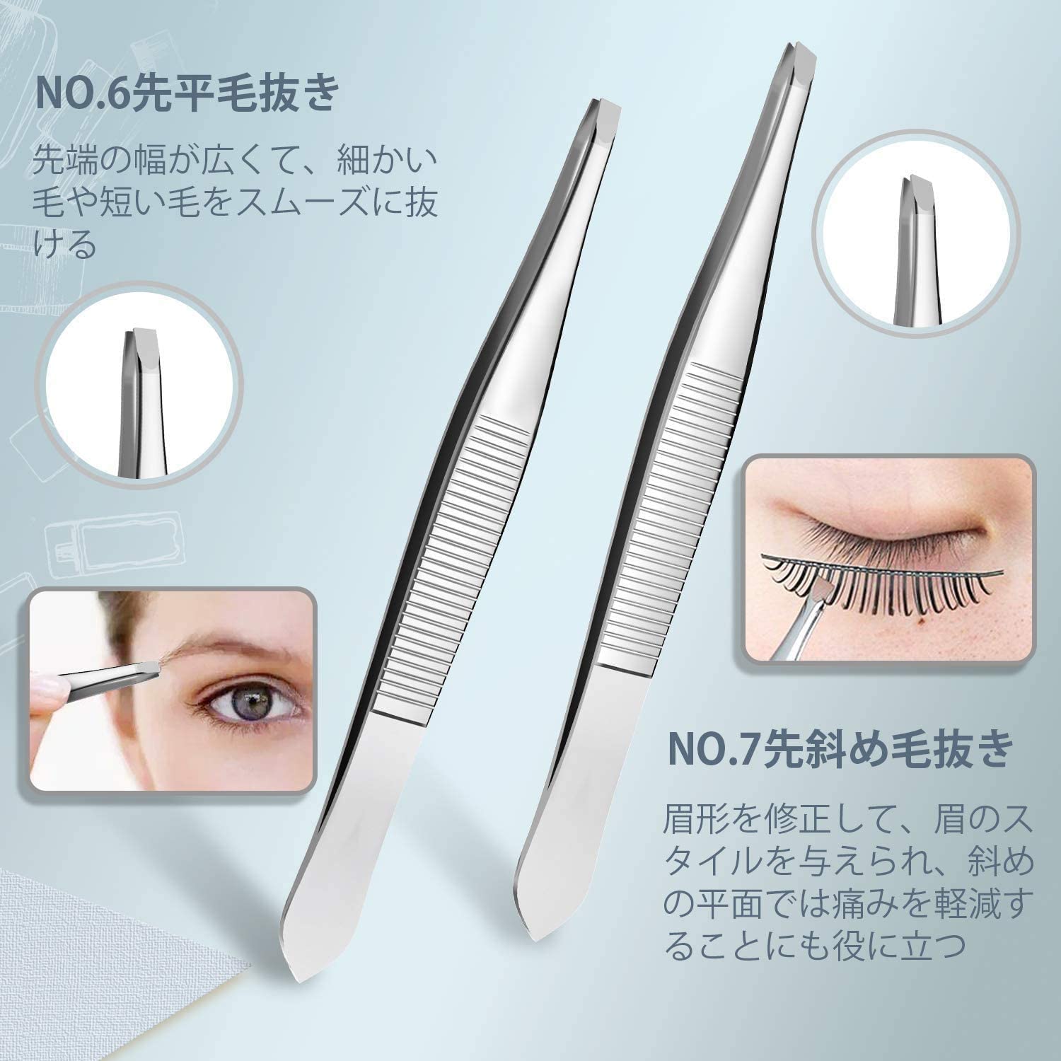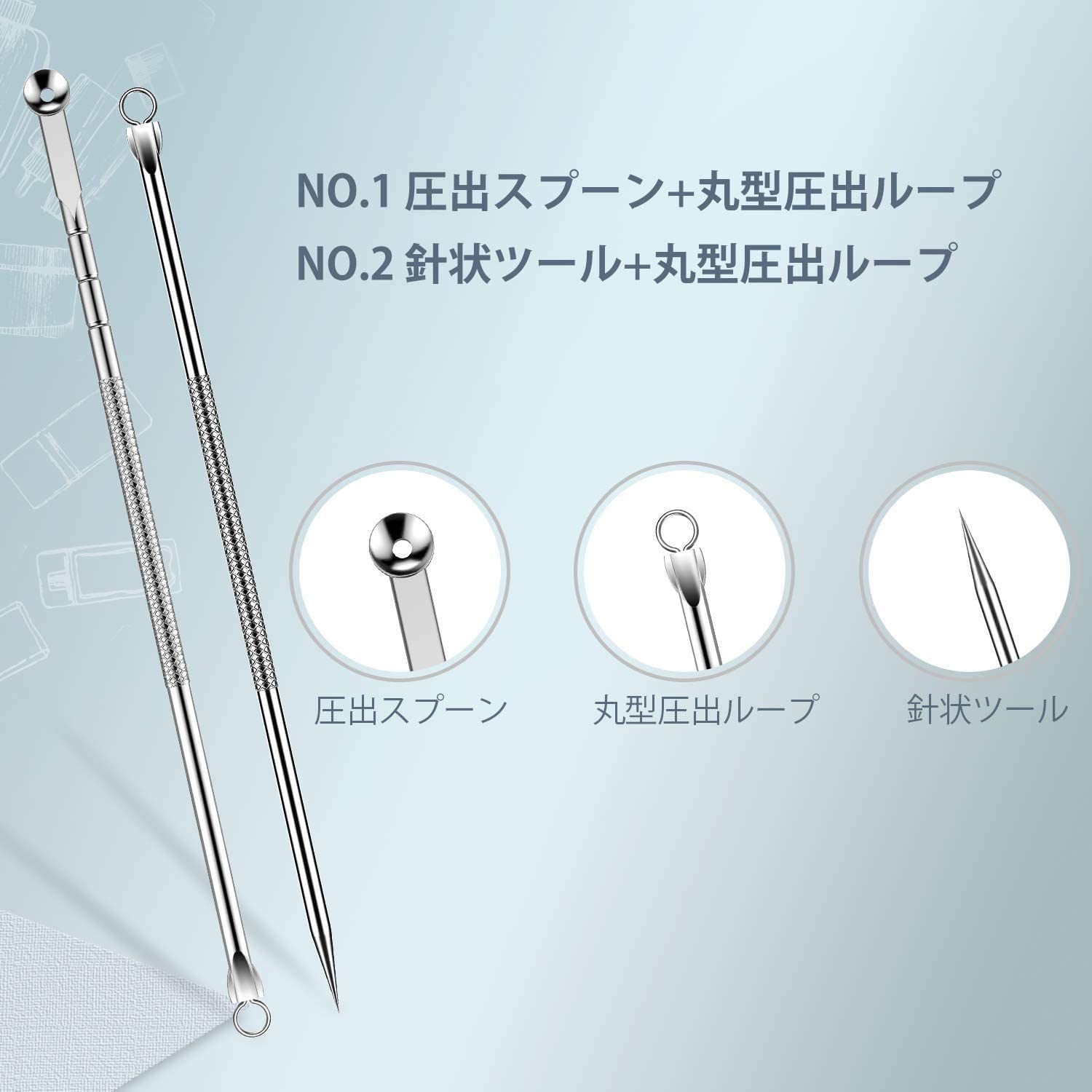 - 7本セット:圧出スプーン+丸型圧出ループ、丸型圧出ループ+針状ツール、楕円ループ+三角形ループ、先曲がりピンセット、精密先細いピンセット、先平毛抜き、先斜め毛抜きの7本セットです。